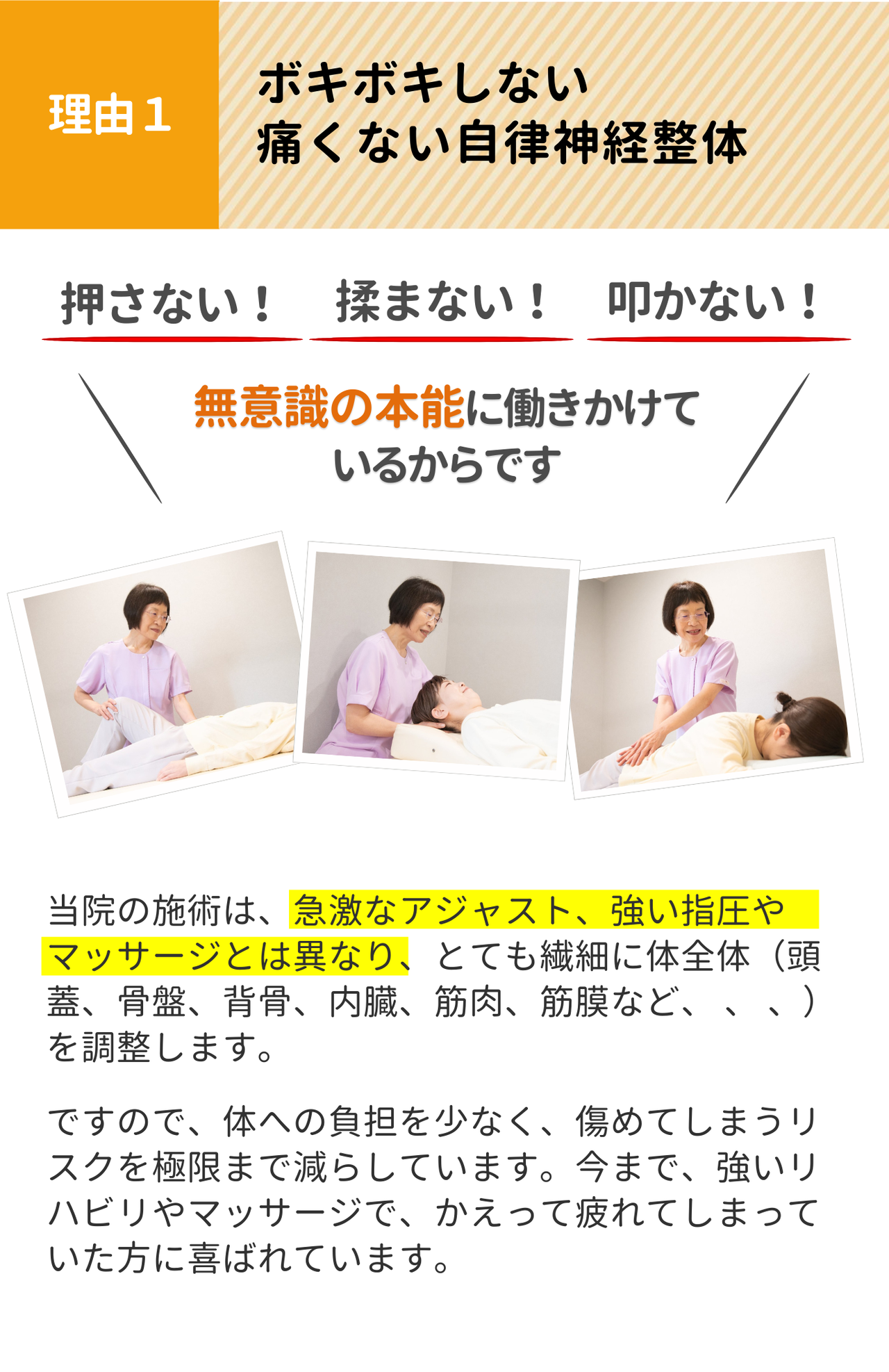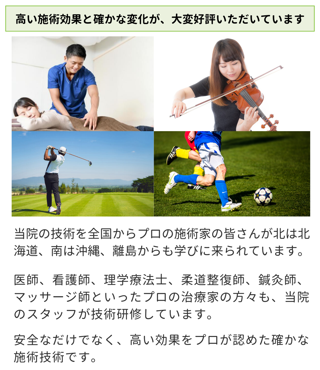 服を着たまま、どんな体勢でも施術できます。痛み、つらい体勢を我慢したりせずに少しでも不安なことやツライことがあったら伝えて下さい。そして、痛みがあったり分からない説明があったら遠慮なく伝えて頂くことが早い回復につながります。